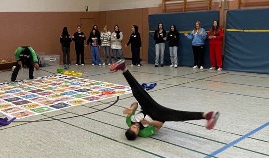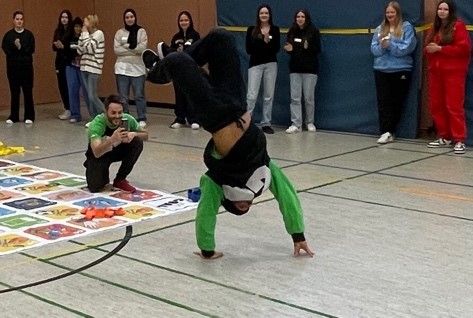 Die Jungs Roman und Moses von Gorilla besuchten am 10.12.2024 die Mittelschule Rödental. Nachdem sie letztes Jahr bereits einen Thementag „Parcours“ durchgeführt hatten, war dieses Jahr ein selbst entwickeltes Gesellschaftsspiel in XXL-Form dran. In einer Mischung aus Wissens-Quiz, sportlichen Aktivitäten und Pantomime traten 4 Teams gegeneinander an. Das war ein gut durchdachtes Konzept, das den Schülerinnen und Schülern viel Spaß gemacht, einiges abverlangt und sie stellenweise an ihre körperlichen Grenzen (beispielsweise beim Plank oder bei den Situps) gebracht hat.