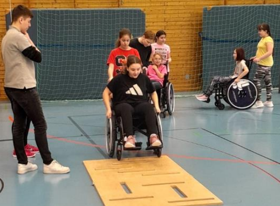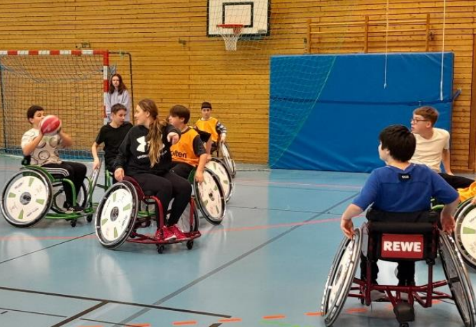 Am 08.03.2023 war der Förderkreis goolkids mit dem Projekt „Rollstuhlsport macht Schule“ bei uns zu Gast. In diesem wurde unseren Schülerinnen und Schülern nicht nur durch Spiel und Spaß das Rollstuhlfahren nähergebracht, sondern auch das Thema Inklusion vermittelt. In einem Teil der Sporthalle stand das Thema „Alltag eines Rollstuhlfahrers“ im Vordergrund. Hier konnten die 5. und 6. Klassen die Grundlagen des Rollstuhlfahrens erlernen, Hürden erkennen und anschließend einen Alltagsparcour überwinden, der Hindernisse wie bspw. Bordsteine, Kopfsteinpflaster und Gullideckel simuliert. Somit bekamen die Jugendlichen aktiv gezeigt, welche Hürden ein Rollstuhlfahrer überwinden muss. Der Großteil war sehr überrascht, wie schwer dies ist und wie alltäglich diese Hürden doch sind – sogar auf dem eigenen Schulweg. Der zweite Teil der Halle war für den sportlichen Part des Tages vorbehalten, denn hier ging es um Rollstuhlbasketball. Diese Sportart zeigt auf spielerische Weise, wie einfach es doch sein kann, Sport als Brücke für gelebte Inklusion zu nutzen. Zunächst bekamen die Schülerinnen und Schüler ein Gefühl für die Sportrollstühle vermittelt. Nach anschließenden Fangspielen und „Technik- und DribblingÜbungen“ ging es auch schon ans Körbewerfen. Im Abschlussspiel zeigten die Schülerinnen und Schüler ihr erlerntes Können, hatten dabei eine ganze Menge Spaß und konnten Teamgeist zeigen. Rollstuhlsport macht Schule Alle 5. Und 6. Klassen durften natürlich beide Einheiten ausprobieren, um sich in die Lage von Rollstuhlsportlern und Rollstuhlfahrern im Alltag hineinzuversetzen. Auffällig war, dass die Jugendlichen sowohl im Alltagsteil als auch im Sportteil des Projekttages extrem schnell ein positives Gefühl für die Rollstühle bekamen und sich eine teils anfängliche Unsicherheit mehr und mehr zu Spaß und Offenheit – teilweise sogar Begeisterung - entwickelte. Wir möchten dem Förderkreis goolkids e.V. für ihr Engagement und das gemeinsame Projekt, welches ein voller Erfolg war, herzlichst danke!