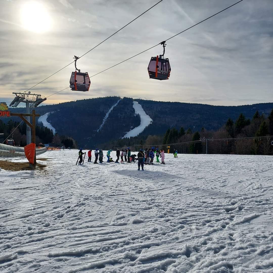 Wir wurden mit einem Kleinbus zur Skipiste „Skiarena Hochficht“ gebracht, fuhren mit der Gondel hoch auf die Mittelstation und starteten - angeleitet von Herrn de Rooij und Herrn Rühr - unsere ersten Versuche auf den Skiern. Das war eine ziemlich wackelige Angelegenheit. Doch schon nach kurzer Zeit durften wir mit dem „Zauberteppich“ die flache Piste nach oben fahren und machten die ersten Abfahrtsübungen. Frau „Paparazzi“ Scheffler war von Anfang an mit ihrer Kamera dabei.