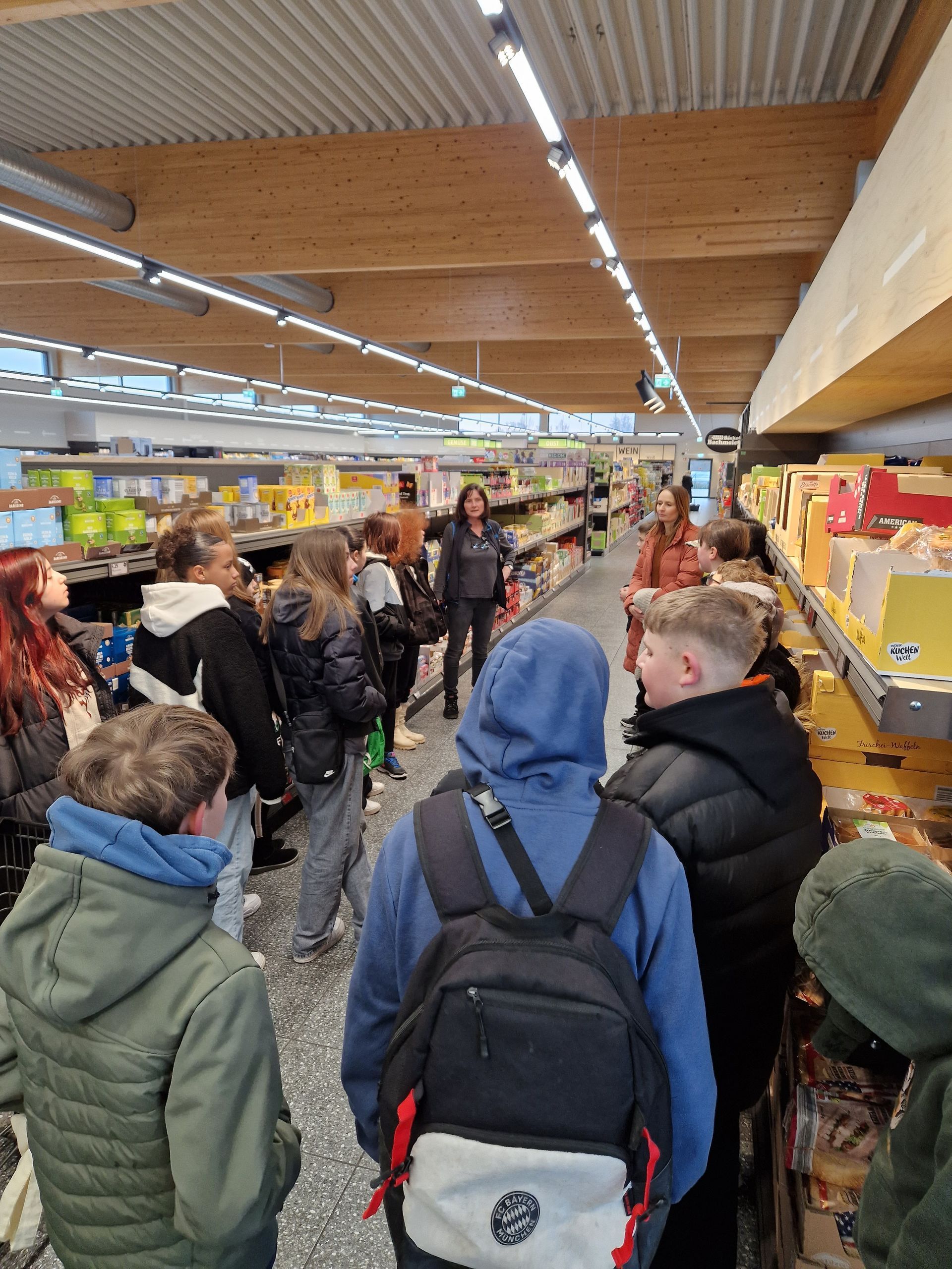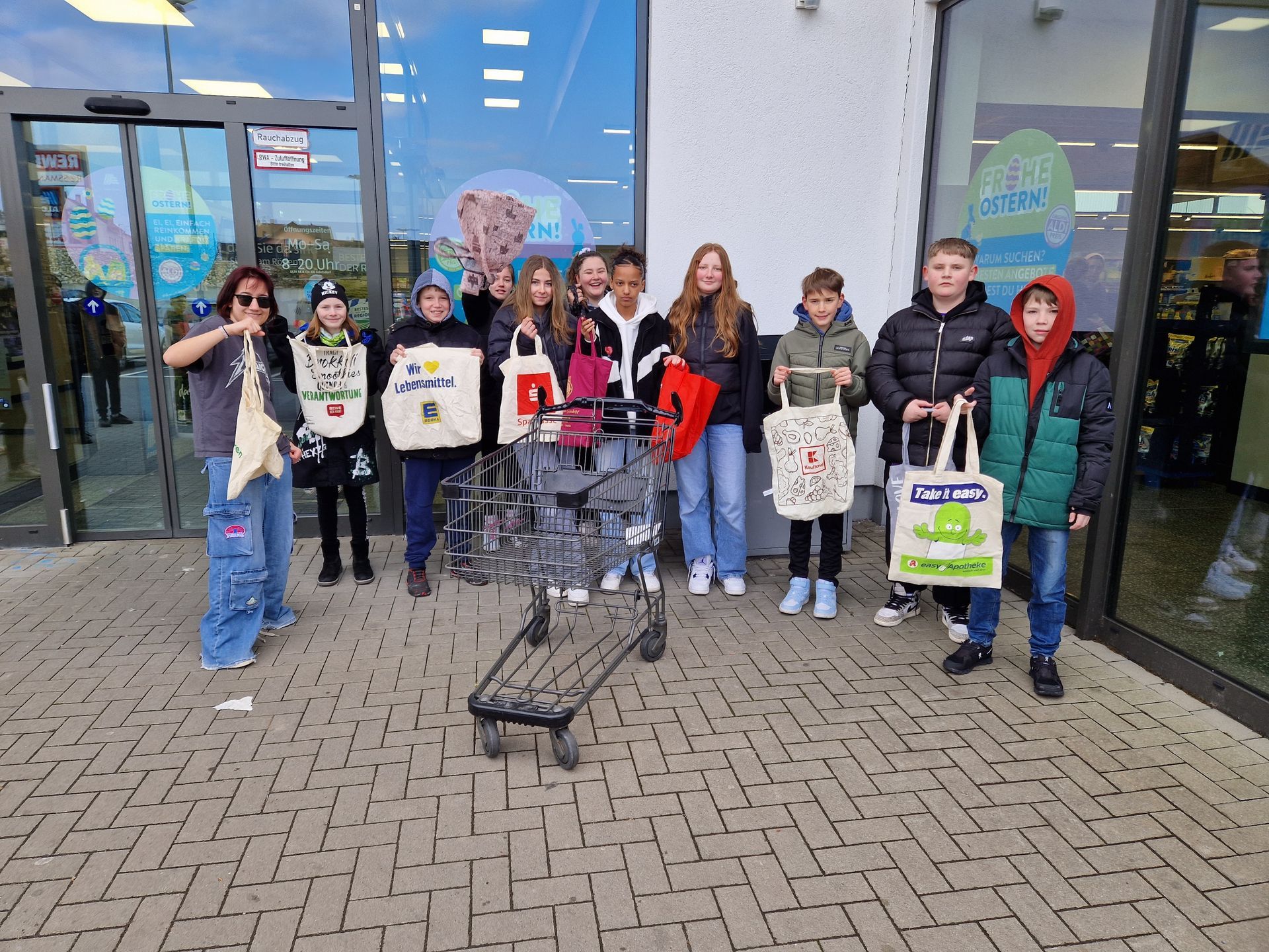 Ein umweltbewusstes Frühstück rundete die Woche ab. Gemeinsam gingen die beiden 6. Klassen im Aldi vor Ort einkaufen. Eine nette Mitarbeiterin informierte die Schüler und Schülerinnen über saisonale und regionale Produkte. Ferner wurde beim Einkauf vor allem versucht auf Plastik und Palmöl zu verzichten.